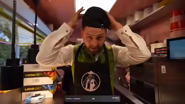 04:53:44Es wird auf die Spendenaktion bei Loco Chicken aufmerksam gemacht, bei der alle Einnahmen einem guten Zweck zugutekommen. Ein Koch, der auch Trick-Shots macht, wird gegrüßt und es wird angekündigt, dass er Burger zubereiten wird. Der Instagram-Kanal des Zauberkünstlers wird erwähnt und dazu aufgerufen, ihm zu folgen. Es wird die weite Anreise des Zauberkünstlers betont, der extra aus Bremen angereist ist. Ein Mitarbeiter im Chicken-Kostüm wird für seinen Einsatz gelobt. Es wird angekündigt, dass Burger zubereitet werden und ein Zauberer neue Tricks vorführt. Später taucht ein Schulfreund auf und bekommt einen Burger spendiert. Es wird überlegt, wer als nächstes einen Burger zubereiten soll und die Zubereitung eines Spezialburgers für einen Zuschauer wird angekündigt. Ein weiterer Schulfreund und ein Vegetarier tauchen auf, die ebenfalls mit Burgern und Pommes versorgt werden. Es wird betont, dass die Aktion einem guten Zweck dient.