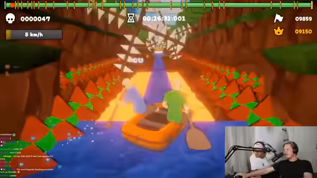 01:10:20Die Konzentration richtet sich ganz auf das Mobile-Spiel 'Paddle Paddle Paddle'. Chil und Johnny versuchen gemeinsam, die Level zu bewältigen, was aufgrund mangelnder Kommunikation und Koordination zu zahlreichen, komischen Fehlern führt. Der Streamer gibt Tipps, doch die Paarung hat Schwierigkeiten, auch nur eine kurze Distanz im Boot zurückzulegen. Der Chat wird zum Mitzählen der Versuche und zur Anfeuerung eingebunden.