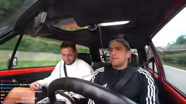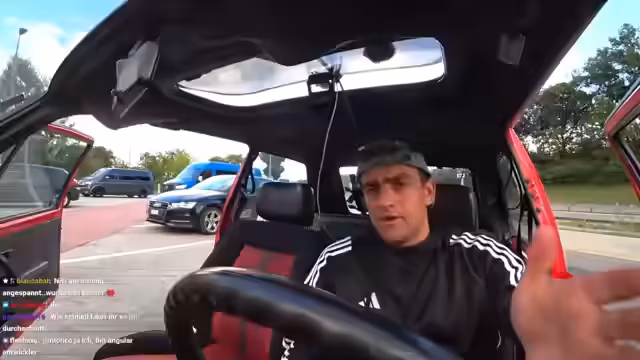 07:57:50Niki beginnt, den Golf 1 GTI zu fahren und stellt Schwierigkeiten beim Anfahren und der Kupplungsbetätigung fest. Er wird im Chat von Zuschauern und dem Streamer ermutigt, die Kupplung schneller kommen zu lassen. Währenddessen überfährt Niki unbeabsichtigt eine durchgezogene Linie und der Streamer gibt ihm unmittelbares, ehrliches Feedback. Der Streamer lobt Niki trotz kleinerer Fehler für seine entspannte Herangehensweise und stellt fest, dass er bisher nichts an die Wand gefahren hat, was ihm große Sicherheit gibt.