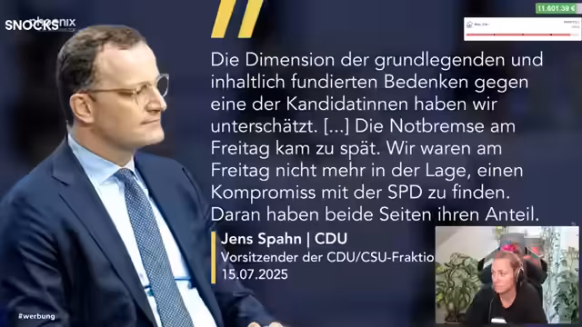 00:05:28Das Gespräch dreht sich um die aktuelle politische Kontroverse in Deutschland, insbesondere um die gescheiterte Wahl von Frau Frauke Brosius-Gersdorf als Richterin am Bundesverfassungsgericht. Der Streamer berichtet über die plötzlichen Plagiatsvorwürfe und die mediale Hetzjagd, die seiner Meinung nach von rechten und rechtsextremen Medien befeuert wurde. Er kritisiert scharf die Union und Kirchenvertreter, die die Kandidatin unter Druck setzten. Der Streamer spricht von einem historischen Vorgang, der das demokratische System gefährdet und fordert eine härtere Bestrafung von Medien, die unwahre Informationen verbreiten und so den Ruf von Personen zerstören.