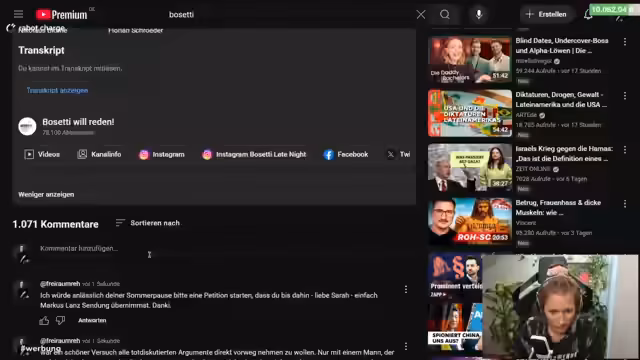 00:14:05Die Streamerin kommt auf die Serie "Schwarze Früchte" zu sprechen, deren Förderung die AfD verhindern wollte. Dies inspiriert sie zu einer neuen Serie für ihre Social-Media-Kanäle: Jeden Tag eine Tat, die die AfD ärgern soll. In einem Brainstorming mit der Community werden verschiedene Titel für dieses Format diskutiert. Parallel dazu beleuchtet sie aktuelle politische Entwicklungen in Spanien, insbesondere Korruptionsvorwürfe gegen die Regierung von Ministerpräsident Pedro Sánchez, und vergleicht diese mit der Situation in Deutschland, wo sie eine laxere Haltung gegenüber Korruption feststellt.