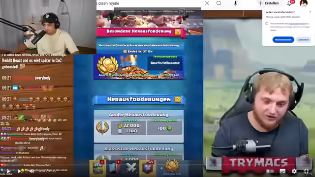 00:15:19Ein spontaner Anruf bei 'Niki Stemmler' führt zu einer Diskussion über dessen Clash Royale-Skills. Ein Streit entbrennt, da Paul bemängelt, dass Nikis Bruder 'Trimax' ihn beim Leveln unterstützt habe, was den Vergleich unfair mache. Dies eskaliert in die Aufforderung zu einem 'Gaming-Olympiade'-Duell über zehn verschiedene Spiele. Der Streamer nutzt die Zeit, um seinen eigenen Clash-Account vorzustellen und.Creator Codes zu bewerben, während er auf Nikis Rückkehr wartet.