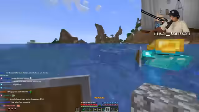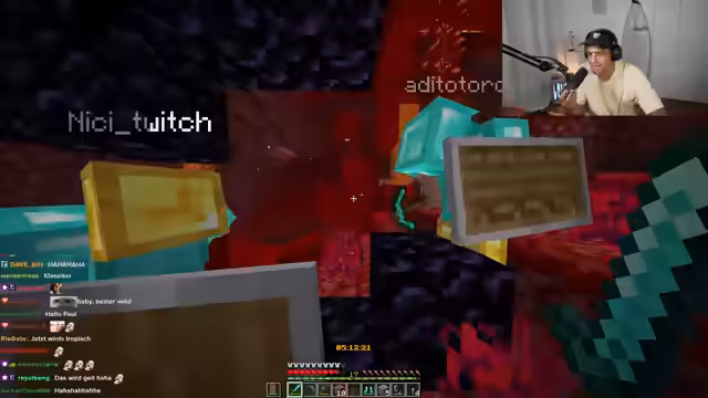 04:47:09Die Gruppe konzentriert sich voll auf die Diamantsuche. Die Chat-Kommunikation wird entscheidend, da sie Tipps zur idealen Suchtiefe gibt (um minus 60). Ein interner, freundschaftlicher Wettkampf entsteht, bei dem jeder Spieler versucht, als Erster Diamanten zu finden. Niki findet mehrere und zeigt sie triumphierend, was Paul dazu veranlasst, ihn des "Rage-Baits" zu beschuldigen, indem er fälschlicherweise Diamanten meldet und später zugibt, es absichtlich gemacht zu haben, um zu provozieren.