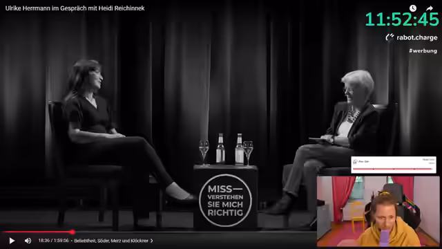 01:21:54Als Einstieg in die politische Diskussion schlägt der Streamer die Monitor-Sendung 'Ein Land am Abgrund' mit Bodo Ramelow und Tijan von der CDU vor. Er lobt Moderator Georg Restle als absoluten Lieblingsmoderator, der auf seinem Kanal linke Takes mit Eigenmeinung bringe, im Gegensatz zu anderen neutralen Moderatoren. Der Streamer betont, dass er wolle, wo man bei Restle stehe - bei einem 'Base-Typ'.