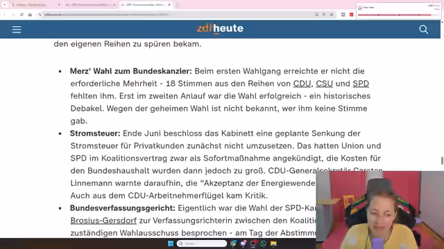03:57:38Die ausbleibende Rentenreform in der aktuellen Legislatur wird als großer politischer Fehler gewertet. Die Aktivrente wird als unzureichend kritisiert, da sie nicht auf den Rentenfonds einzahlt, und die Hoffnung auf echte Reformen in der Legislatur als gering eingeschätzt. Die Streamerin wendet sich der Vorbereitung auf den nächsten Bundestagswahlkampf zu und prophezeit eine trump-manierische Inszenierung durch AfD und Union mit großen Arenen, Influencern und eingeschränktem Pressezugang. Die Kanzlerkandidaten der Union sind noch unklar.