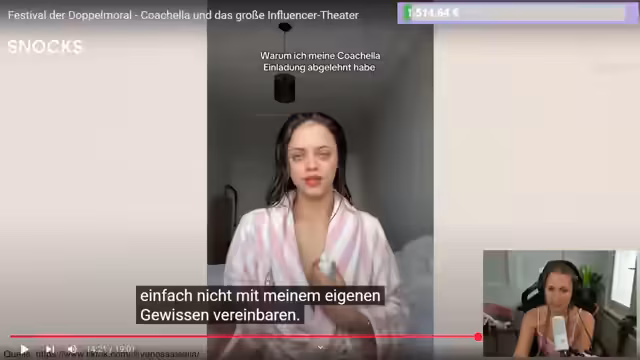 00:29:48Das Thema wechselt auf das aktuelle Sascha-Video über das Coachella-Festival. Coachella wird als eines der größten Musikfestivals der Welt beschrieben, das sehr kulturell und farbenfroh wahrgenommen wird. Kritikpunkt ist jedoch, dass der Betreiber ein rechtsextremes Umfeld haben soll. Der Erzähler fragt nach der Haltung von Künstlern wie Green Day, die dort auftreten, und kündigt an, dass das Video von Sascha vor allem die Doppelmoral der bezahlten Influencer aufzeigen soll. Die Beziehungen zwischen Festival, Influencern und Marken werden erklärt. Es wird das Barter-Deal-Modell, Affiliate-Links und Bezahlmodelle, bei denen Influencer für ihre Reise, Unterkunft und Content-Produktion bezahlt werden, durchleuchtet. Die Frage der moralischen Integrität wird gestellt.