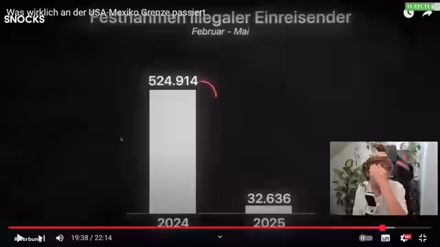 03:10:44DieStreamerin startet die Dokumentation, die die harten Lebensbedingungen an der Grenze zwischen den USA und Mexiko zeigt. Es werden Szenen aus San Diego gezeigt, mit einer großen Grenzmauer, schwer bewaffneten Grenzpolizisten und Helikoptern. Die Dokumentation stellt die hohe Zahl an legalen Grenzübertritten gegenüber illegalen Einwanderungen und geht auf die Geschichte des Grenzbaus unter Präsidenten Clinton, Bush, Obama und Trump ein. Die dramatischen Szenen an der Grenzmauer mit den Vermisstenanzeigen und die Gefahren der Fluchtroute werden eindrücklich dargestellt.