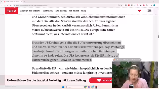 00:37:36Die EU steht in der Venezuela-Krise unter Druck: Sie kann sich nicht deutlich gegen die USA stellen, da sie von US-Technologie und -Marktzugang abhängig ist. Bei einem Gipfel in Kolumbien blieben klare Verurteilungen der US-Angriffe aus – teilweise wegen drohender US-Zölle und NATO-Austrittsdrohungen. Nur Frankreich, Niederlande und Großbritannien unterbrachen Geheimdienstinformationen mit den USA. Experten fordern, dass die EU neue Partnerschaften in Lateinamerika auf Augenhöhe suchen muss, statt nur Ressourcen zu nutzen.