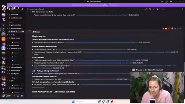 00:42:36Kuro, eine engagierte Zuschauerin, betreibt einen eigenen Discord-Channel namens 'Kuros News Channel' unter dem Stream-Bereich. Dort werden tagesaktuelle Nachrichten aus dem Ausland (z.B. Venezuela, Chile, Sudan, Iran, Gaza, Libanon, Hongkong, Thailand, Myanmar) und Inland zusammengestellt. Kuro leistet diese Arbeit ehrenamtlich, obwohl die Zusammenfassung viel Zeit beansprucht, und empfiehlt die Nutzung als täglichen Informationsdienst. Der Channel wird als wertvolle Ressource für geopolitische Entwicklungen hervorgehoben.