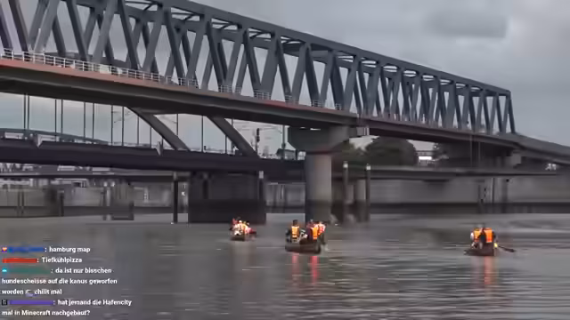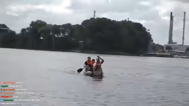 08:25:36Nachdem die Kanus verlassen und der Stream kurzzeitig auf "Black Screen" geschaltet wurde, um die Route geheim zu halten, treffen die Streamer am Zielort in Hamburg ein. Das Team wieder vereint, geht es um die letzten Meter bis zur Elbphilharmonie. Die Begeisterung über das geschaffte Vorhaben ist groß. Gleichzeitig wird auf die gefährlichen Bedingungen auf der Elbe, wie große Schiffswellen, hingewiesen, an denen die Gruppe den ganzen Tag hindurch konzentriert navigieren musste. Die Ankunft wird gefeiert und die MVPs der Tour, wie Jofi und Kuba, werden im Chat gelobt.