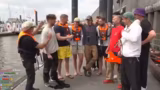 08:41:22Auf den letzten Metern vor der Elbphilharmonie wird noch intensiv gepackt und alles für den finalen Auftritt vorbereitet. Sonnencreme ist ein wichtiges Thema, da die Streamer sich gegen die Sonne schützen müssen. Auch die Verteilung der letzten Wasserflaschen und das schnelle Zusammenpacken der restlichen Ausrüstung sind die letzten Aufgaben vor der Ankunft. Captain Kai, das Kameraboot, ist bei der letzten Runde dabei und dokumentiert die triumphale Ankunft. Die Stimmung ist angespannt und aufgeregt zugleich.