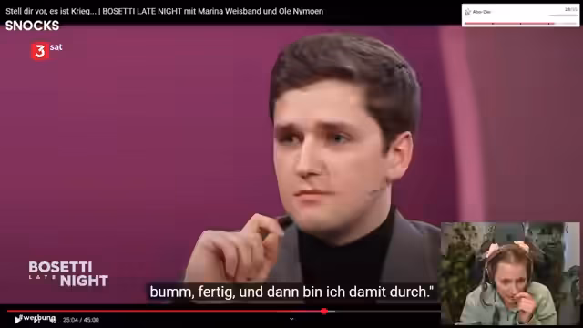 03:23:57Der Streamer begrüßt seine Gäste Ole Nimun und Marina Weisband und formuliert das zentrale Thema der Sendung: die Auseinandersetzung mit Aufrüstung und Abrüstung. Er verkündet mit einem Augenzwinkern, das Ziel sei, mit dieser Sendung den Dritten Weltkrieg zu verhindern. Die Gäste werden vorgestellt; Marina Weisband ist Psychologin und Publizistin, bekannt als ehemalige Piraten-Chefin, und Ole Nimun ist Journalist und Podcaster. Die嘉宾 stellen sich kurz vor.