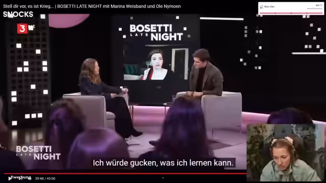 03:20:59Zu Beginn des Streams wird darauf hingewiesen, dass das Mikrofon und der Bullshit-Button zu selten genutzt werden, was der Streamer als schädlich für die Sendung empfindet. Trotzdem wird die Sendung als banger beschrieben. Zudem wird ein Angebot bekannt gegeben, wer Bosetti kritisiert, kann eine Mail schreiben und erhält eine kostenlose Karte. Zwei Personen im Publikum werden erwähnt, die den Streamer nicht leiden können und eines davon soll regelmäßig einschlafen, was im Verlauf des Streams thematisiert werden könnte.