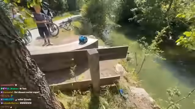 00:22:50Nachdem sie die Rampe erreicht haben, beschließen sie, mit Springen zu starten, als Warm-up für die Hauptstrecke. Der Streamer macht sich Sorgen, dass er vor der Rampe aufschlägt. Obwohl die Stimmung eher entspannt ist, gibt es zusehends mehr Zuschauer und andere Fahrer. Ein Biker namens Leo wird gefilmt, als er einen Backflip erfolgreich landet.