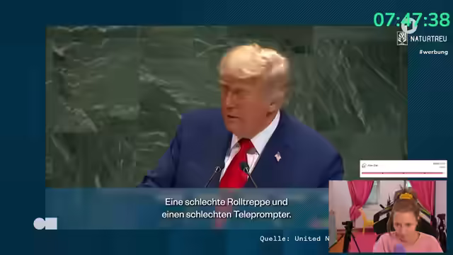 00:26:20Es wird angekündigt, dass der Stream mit der Sendung Miosga beginnt. Thema ist die Frage, ob Trump ein lupenreiner Demokrat ist und wie der deutsche Außenminister darauf reagiert. Die Streamerin freut sich darauf, die Sendung anzusehen und zu kommentieren. Es wird kurz auf die Notwendigkeit von Ton hingewiesen. In der Sendung geht es um die Rolle der USA in der Weltpolitik und die Frage, ob Deutschland eine neue Außenpolitik braucht. Es wird ein Ausschnitt einer Rede von Donald Trump gezeigt, in dem er sich über die Vereinten Nationen und eine defekte Rolltreppe beschwert. Die Streamerin und der Chat diskutieren darüber, ob Trumps Reden von einem Teleprompter abgelesen werden und wer ihm diese Reden schreibt. Es wird spekuliert, ob Trump bewusst als Zwölfjähriger dargestellt wird.