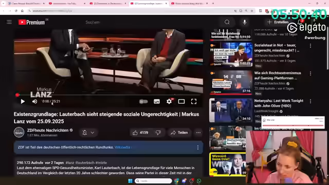 08:22:17Der Streamer berichtet über seine persönliche Einschätzung der politischen Ausrichtung des Streams. Er empfindet ihn als tendenziell linkslastig, wurde aber bereits als Zentristin, Liberal und Nicht-Links beschimpft. Er und der Chat einigen sich auf den Begriff 'linksähnlich' als treffendste Beschreibung. Gleichzeitig wird der Wunsch geäußert, eine Folge von Markus Lanz zu schauen, wobei klar ist, dass nur ein Ausschnitt gezeigt wird, um der Streamerin nicht zuzumuten. Die Diskussion dreht sich um die politische Ausrichtung im Allgemeinen und um den Wunsch, andere Meinungen kennenzulernen.