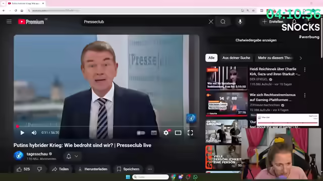 09:28:32Die Gäste des Presseclubs werden vorgestellt, darunter Florian Flade von der Recherche-Kooperation aus WDR, NDR und Süddeutscher Zeitung, Marina Krombaki vom Spiegel Hauptstadtstudio und Christoph Schlitz von der Welt. Das Hauptinteresse am Presseclub liegt in der Fragerunde am Ende. Die Sendung wird oft als "Quälerei" empfunden, aber es besteht die Hoffnung, dass diese Ausgabe besser ist. Das Thema des Presseclubs ist Putins hybrider Krieg und die Bedrohungslage. Es wird erwähnt, dass der Presseclub seit einiger Zeit nicht mehr im Stream gezeigt wurde, da die Streamerin zwischenzeitlich in Sizilien war und bei der Seenotrettung geholfen hat. Es wird spekuliert, ob Blogs oder Podcasts cooler sind, wobei die Streamerin einen klaren Favoriten hat.