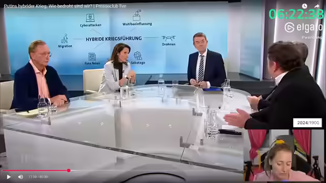 09:30:20Im Presseclub wird über hybride Kriegsführung diskutiert, einschließlich Cyberangriffe und Sabotageaktionen, die Russland zugeordnet werden. Es wird festgestellt, dass sich die Art der Kriegsführung verändert hat und ein Graubereich zwischen Krieg und Frieden entstanden ist. Die Kosten für Putin, den russischen Präsidenten, sind relativ gering, während die Ziele darin bestehen, die europäische Staatsordnung zu verunsichern und die Unterstützung der Ukraine zu bestrafen. Durch die vermehrten Flüge im Luftraum wird der Fokus vom Ukraine-Krieg abgelenkt und Ressourcen gebunden. Es wird auch die Verteidigungsfähigkeit des Westens infrage gestellt und gezeigt, dass der Westen handlungsschwach ist. Die Angriffe dienen auch dazu zu testen, wie der Westen technisch auf seine Verteidigung eingestellt ist. Die Verunsicherung ist ein wesentlicher Punkt, und es braucht keinen militärischen Angriff mehr, wenn die NATO uneinig ist.