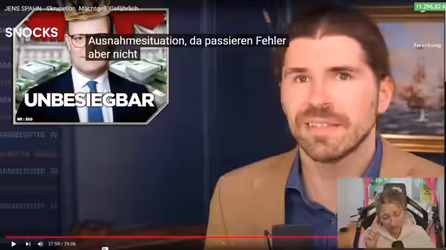 00:26:23Der Streamer vertieft die Analyse von Jens Spahn und bezeichnet ihn als einen „durchtriebenen Machtpolitiker“. Es werden fünf Hauptpunkte zusammengefasst: die teure Maskenbeschaffung über parteinahe Freunde, der Kauf einer Pandemie-Villa von einem Pharma-Lobbyisten, der ungewöhnliche Kredit ohne Eigenkapital von seinem Ex-Chef, die Vermischung von privaten und beruflichen Kontakten und die fehlenden Konsequenzen trotz aller Skandale. Der Streamer betont, dass Spahn inzwischen eine zentrale Position in der CDU einnimmt und potenziell gefährlich für die Politik werden könnte.