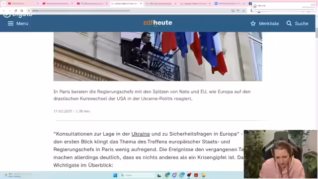 00:08:49Nach einem leichten Austausch über persönliche und vergangene YouTube-Challenges leitet der Stream zu dem Hauptthema über, dem Krisengipfel in Frankreich. Es werden die Teilnehmer des Gipfels genannt, bei dem es um die Reaktion Europas auf den Kurswechsel der USA unter Trump bezüglich der Ukraine-Politik geht. Zentral ist die Frage, wie Europa die Verantwortung für einen möglichen Friedensdeal und die Absicherung der Ukraine übernehmen kann, nachdem die USA sich zunehmend zurückziehen und eine starke ukrainische Armee auch in Friedenszeiten gefordert wird.
