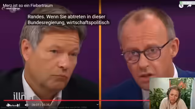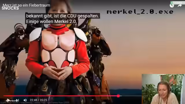 00:34:11Der Streamer präsentiert und analysiert ein satirisches Video über Friedrich Merz, das die Kritik des Kanals '2BotGuys' aufgreift. Das Video stellt Merz als oberen Mittelständler dar, der sein Hobbyfliegen für politische Zwecke nutzt und die 'linksgrüne Versiffung' des Landes anprangert. Der Streamer lobt den Stil des Videos, der an die Serie 'Stromberg' erinnert, und hebt besonders den satirischen Charakter und die Schnitte positiv hervor. Währenddessen zitiert er Merz' Aussagen, wie den Vergleich der CSU-Ministerfrau mit einem 'aufgedunsenen Frosch' und seine Darstellung als 'waschechter Pilot' für Deutschland, was den ironischen Ton des Videos unterstreicht.