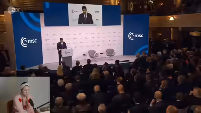02:34:34Die Rede wird von Teilen des Publikums mit standing ovations und sichtbarem Aufatmen aufgenommen, was als Erleichterung über das Ausbleiben einer härteren Kriegsrhetorik gewertet wird. Während die Streamerin die Rede als bedrohlich und faschistisch einordnet, interpretieren Medien und die politische Elite sie als versöhnlich und positives Zeichen für die transatlantische Beziehung, was einen starken Kontrast darstellt.
