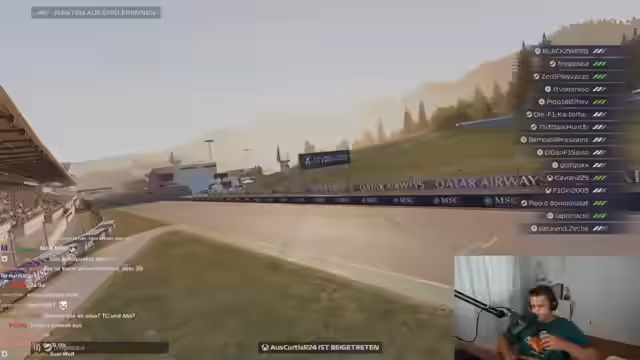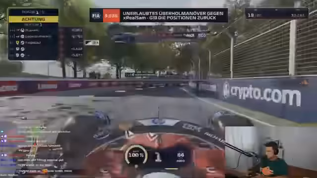 00:29:10Während des Rennens fährt der Streamer mit abgeschalteten Fahrhilfen und verliert nach einer Kollision seinen Frontflügel, was seine Fahrzeugkontrolle beeinträchtigt. Nach einer unfairen Kollision fordert er den Kontrahenten auf, den Platz zurückzugeben. Parallel zur Fahrt interagiert er intensiv mit dem Chat, lobt den 'Cutter Lukas' für seine Rennleistungen und setzt einen Fokus auf die Community, indem er nicht chataktive Teilnehmer aus der Lobby wirft, um ein persönlicheres Rennen zu ermöglichen.