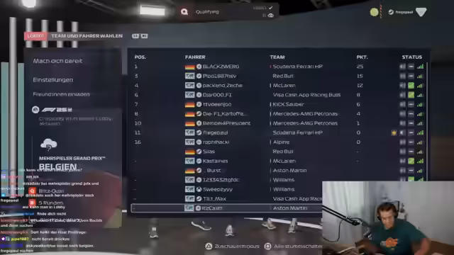 00:16:31Nach zahlreichen Anfragen und positiver Resonanz im Chat beginnt der Streamer mit einem Formel 1-Spiel, bei dem er gegen seine Zuschauer antreten möchte. Obwohl er sich über den Verzicht auf ein Lenkrad ärgert und sich als Anfänger im Streaming von zu Hause outet, zeigt er großes Engagement und Euphorie für das Spiel. Er richtet eine offene Lobby ein und fordert die Zuschauer auf, beizutreten, um gemeinsam Rennen zu fahren und Punkte in einer imaginären Weltmeisterschaft zu sammeln.