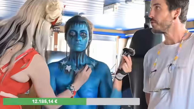 02:11:57Das Bodypainting-Thema wird vorgestellt: Es symbolisiert den Konflikt zwischen der sterbenden EU und der positiven Kraft der Seenotrettung. Kim soll die sterbende EU darstellen, in dunkelgrün-blau mit Kerzen auf den Schultern und schwarzen Handschuhen, die Unterdrückung symbolisieren. Amanda hingegen verkörpert die positive Seite der Rettung, eine strahlende Sonne, mit glitzernden, goldenen Elementen, die Hoffnung und helfende Hände repräsentieren. Die 12 Sterne der EU-Flagge sollen dabei auch als verlorene Vollkommenheit und Einheit interpretiert werden.