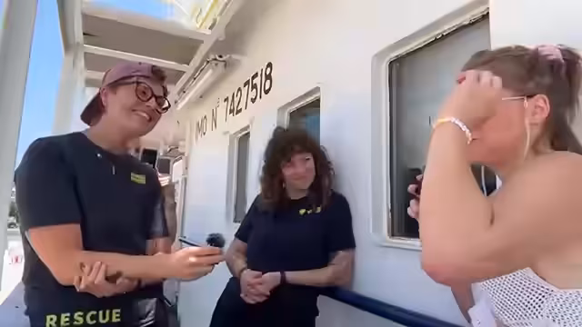 00:22:33Die Tour geht zur Brücke, dem zentralen Kontroll- und Kommunikationszentrum des Schiffes. Hier arbeiten Kapitänin, Offizierinnen und Koordinatorinnen für Such- und Rettungseinsätze (SAAR). Von der Brücke aus werden Einsätze koordiniert und Funksprüche empfangen. Die Crew zeigt die beiden Einsatzboote, RIPS genannt, und erklärt deren Besatzung und Ausrüstung. Der Ablauf einer Rettung wird detailliert beschrieben: von der Alarmierung, über die Einschätzung der Lage, bis hin zur Verteilung von Rettungswesten und dem Transport der Geretteten in die Donkey-Rafts, um Stabilität zu gewährleisten.