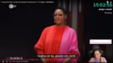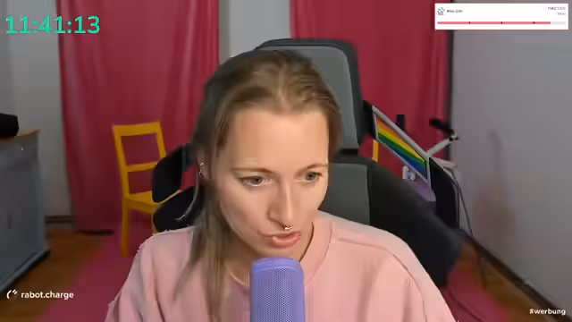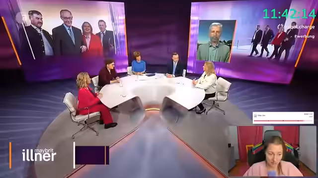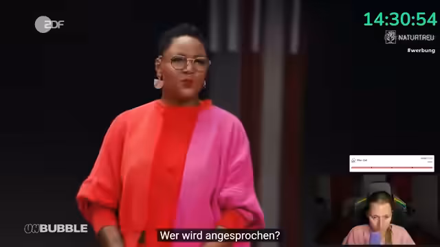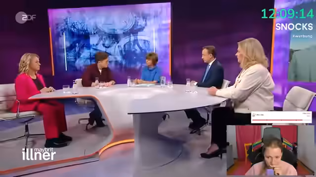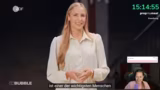 00:38:42Nach einem Hinweis auf "Backgrounds" und politisches Gossip, das sie im Stream selbst nicht thematisieren will, schlägt die Streamerin vor, sich die aktuelle Ausgabe von "Maybrit Illner" anzusehen, in der unter anderem Philipp Türmer und Boris Palmer zu Gast sind. Sie sieht darin die Gelegenheit, nach dem emotionalen Thema SOS Humanity wieder ins politische Geschehen einzusteigen. Der Ton wird wieder kämpferischer und sie verlangt von der Community, sich auf "Politik auf die Fresse" einzustimmen, während sie gleichzeitig vermisst, dass die Jusos der SPD in den Debatten fehlen.