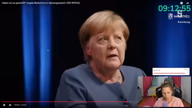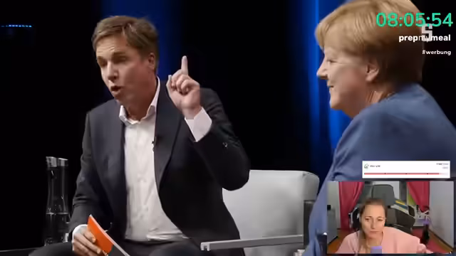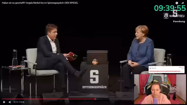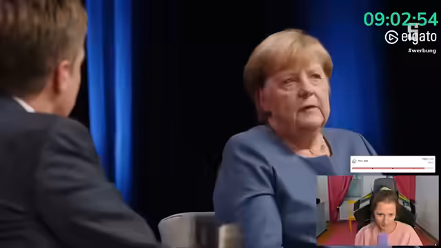 04:28:31Nachdem die Heizungsproblematik kurzzeitig gelöst ist, steht eine Abstimmung an. Die Zuschauer sollen wählen, ob sie sich zuerst das Spitzengespräch mit Angela Merkel ansehen oder die ZDF-Sendung 'Deutschland über alles'. Letztere befasst sich mit dem Einfluss von Trump und der AfD auf die Gesellschaft. Die Abstimmung fällt knapp aus und der Stream startet mit dem Talk bei Angela Merkel, die zu einer Kritik ihrer Amtszeit befragt wird.