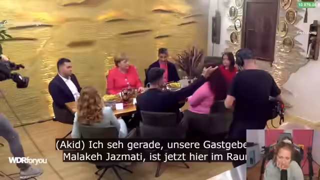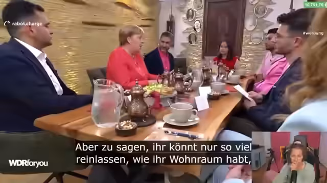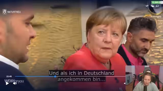 01:06:43Der Streamer zeigt das WDR4U-Format mit Angela Merkel und geflüchteten Personen. Der Moderator Bohan Akit stellt sich und seinen Kollegen Bamdad Ismaili vor, die beide selbst geflüchtet sind. Sie interviewen Angela Merkel in einem syrischen Restaurant. Es ist ein Tischgespräch, keine reine Dokumentation. Die Gäste sind Nagis, Akram, Mahsa, Sadiar und Jutta, die 2015 nach Deutschland geflohen sind und ihre Geschichten teilen.