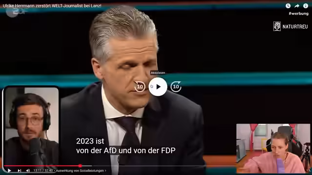 01:14:53Die Ergebnisse der Oberbürgermeisterwahl in Meißen, bei der ein AfD-Kandidat unterlag, werden besprochen. Es wird vor der Verbreitung von Falschinformationen auf Social-Media-Plattformen gewarnt, insbesondere auf X (ehemals Twitter). Ein Ausschnitt aus der Sendung "Markus Lanz" wird analysiert, in dem über die Finanzierbarkeit des Sozialstaates diskutiert wird. Die Wirtschaftsjournalistin Ulrike Herrmann widerspricht der Aussage von Friedrich Merz, dass Deutschland sich den Sozialstaat nicht mehr leisten könne, und argumentiert, dass dies eine übertriebene Darstellung sei. Es wird kritisiert, dass Merz' Rhetorik die AfD stärkt, da sie Ängste vor einem wirtschaftlichen Abgrund schürt. Die Bedeutung von Sozialleistungen als Konjunkturstabilisator wird hervorgehoben. Die Auswirkungen von Sparmaßnahmen auf das Konsumverhalten und die Binnenwirtschaft werden thematisiert. Es wird die Sorge geäußert, dass Merz' Machthunger dazu führt, dass er bereit ist, sich politisch nach rechts zu bewegen.