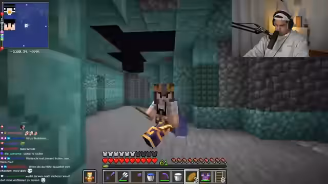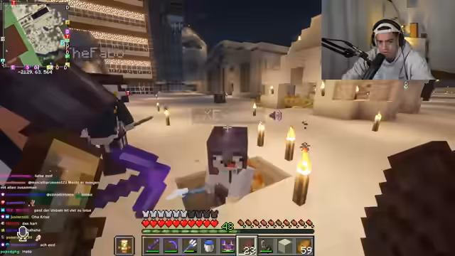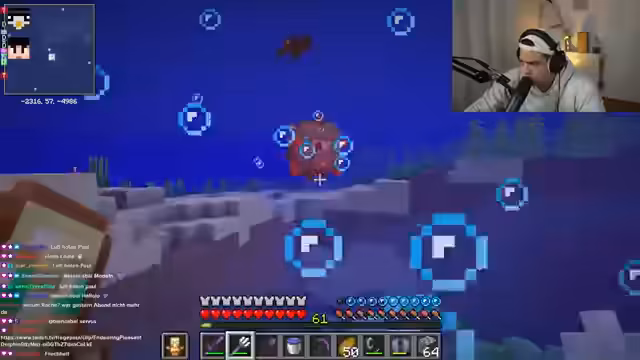 02:45:36Der Chat wird von kontroversen Kommentaren über Streamer und deren Verhalten überschwemmt, was zu einer kurzen Ablenkung führt. Die Streamer versuchen, die Situation zu handhaben und sich wieder auf das Hauptziel zu konzentrieren: die Beschaffung eines Elder Guardian-Fisches. Fabo und der Streamer suchen nach einem Wassertempel, um den Fisch zu finden, der für den Prank an Nick benötigt wird. Es wird diskutiert, wie der Fisch transportiert werden soll, möglicherweise über den Nether. Während der Suche kommt die Frage nach der Herkunft von Spenden auf, und es wird humorvoll über Geldwäsche und moralische Kompasse gesprochen. Die Suche nach dem Wassertempel erweist sich als schwierig, da die Streamer nicht genau wissen, wie ein solcher Tempel aussieht oder wo er sich befinden könnte. Die Elytra-Schleuder von Cast Crafter wird als mögliche Hilfe für die weite Reise in Betracht gezogen.