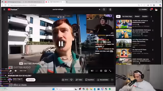 04:54:23Der Fokus verschiebt sich komplett von Minecraft zu einem Reaction-Stream. Zuerst wird ein Video von Sascha Hellinger über ein Hide-and-Seek-Spiel auf einem Schiff begonnen. Der Streamer ist gespannt und lobt das Format, während er das erste Mal zuschaut.