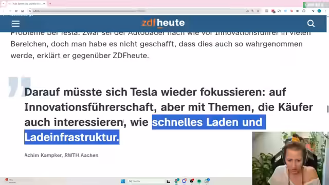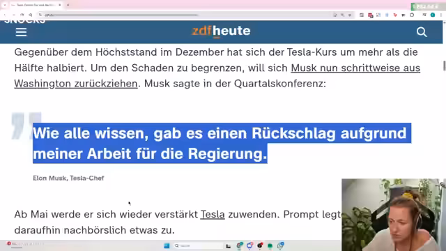 00:30:14Der Streamer beginnt mit der Besprechung einer überreichten News über die dramatischen Umsatz- und Gewinnbrüche bei Tesla. Sie analysiert die Gründe für den Absturz und ordnet sie direkt in den Kontext der politischen Unterstützung von Elon Musk für Donald Trump. Die Entscheidung von Musk, als Berater für die US-Regierung zu arbeiten, wird als Hauptgrund für den Imageverlust und den darauf folgenden Kundenboykott identifiziert, der zu einem massiven Nachfrageeinbruch geführt hat.