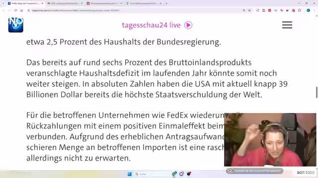 00:39:33Das nächste große Thema ist eine Klage des Logistikkonzerns FedEx gegen die US-Regierung. Nachdem der Supreme Court feststellte, dass rund 70 Prozent der von Trump verhängten Zölle rechtswidrig waren, klagt nun FedEx auf die vollständige Rückerstattung der bereits gezahlten Beträge in Milliardenhöhe. Der Streamer bewertet dies als logische Konsequenz und erwartet, dass weitere Unternehmen folgen werden. Das löst eine Debatte über die Staatsverschuldung der USA aus, die mit knapp 39 Billionen Dollar bereits die höchste der Welt ist.