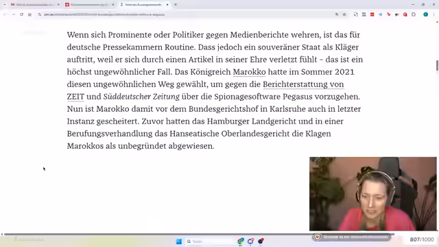 00:48:23Auf Wunsch eines Zuschauers geht der Streamer auf ein Grundsatzurteil des Bundesgerichtshofs (BGH) ein. Das Gericht wies eine Klage Marokkos gegen die Zeit ab, die über die Spionage-Software Pegasus berichtet hatte. Der BGH entschied, dass ausländische Staaten keinen presserechtlichen Ehrenschutz in Deutschland genießen und somit nicht auf Unterlassung klagen können. Dies ist ein historisches Urteil zur Stärkung der Pressefreiheit und ein wichtiger Präzedenzfall für zukünftige Fälle.