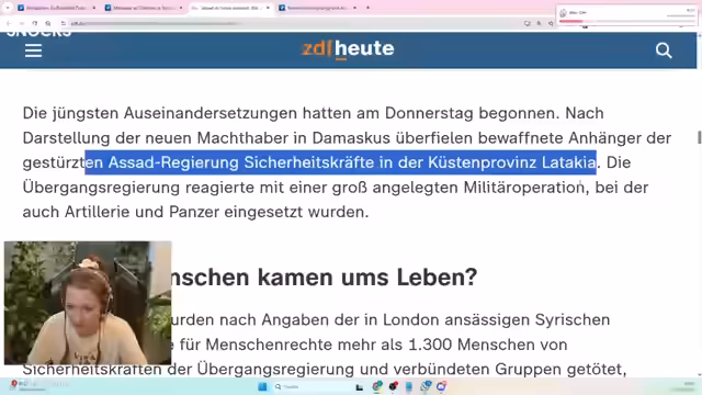 00:36:01Die Streamerin beginnt mit der Berichterstattung über die Gewalt in Syrien und blendet verstörende Bilder aus. Sie zeigt einen Bericht über Milizen auf Motorrädern, die Jagd auf Alawiten machen und einen älteren, unbewaffneten Mann töten. Die Streamerin betont, dass es wichtig ist, sich bewusst zu sein, was in Syrien passiert, und blendet nur das Härteste aus. Es wird berichtet, dass die Gewalt unter dem Deckmantel einer Sicherheitsoperation stattfindet und sich vor allem gegen die alawitische Minderheit richtet, der auch der ehemalige Machthaber Assad angehört. Die Regierung schickt Verstärkung, aber auch Milizen beteiligen sich an den Kämpfen, was zu Vergeltungsaktionen und Leichen am Straßenrand führt. Die Streamerin erwähnt unterschiedliche Zahlen zu den Todesopfern, von Hunderten bis Tausenden, und betont, dass die Informationen mit Vorsicht zu genießen sind. Sie stellt fest, dass Syrien auf keinen Fall ein sicheres Herkunftsland ist. Die Streamerin erwähnt einen Podcast, in dem ein anderer Auslöser für die Gewalt genannt wurde. Es wird berichtet, dass die Regierung die Verhaftung von Mitgliedern der Motorradmiliz angekündigt hat und dass Alawiten in Damaskus Schutz von der Übergangsregierung fordern.