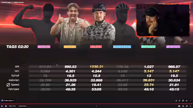 00:53:52Eine entscheidende Wendung im Rennen zeigt sich bei André, der von einem aggressiven Fahrstil in einen "Finisher-Modus" wechselt. Sein Ziel ist nicht mehr, die Konkurrenten zu schlagen, sondern den Radius nur noch zu schaffen. Diese strategische Anpassung nach körperlichen Problemen, wie Durchfall und Erschöpfung, wird als nachvollziehbar und sinnvoll bezeichnet. Gleichzeitig versucht Daniel, seine 400-Kilometer-Marke in 24 Stunden zu erreichen, was ihm laut dem Streamer trotz anfänglichen Vorteils im Rennen gegen André nun wieder massiv Zeit kostet.