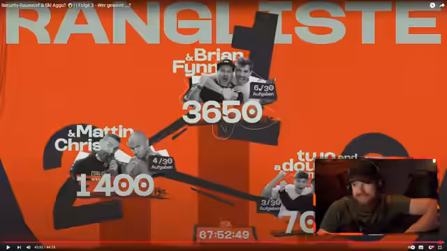 02:14:19Die Teams agieren intensiv an den gestellten Aufgaben. Ein Hauptkonflikt entsteht durch eine Aufgabe, die ein Foto im Schaufenster erfordert, deren Definition und Umsetzung stark diskutiert wird. Der Streamer und sein Partner scheinen dabei auf Schwierigkeiten zu stoßen und versuchen kreative Lösungen zu finden, während die körperliche und mentale Belastung bei den Teilnehmern, insbesondere bei Martin, deutlich spürbar wird.