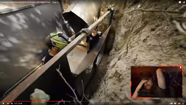 00:22:07Der Fokus des Streams liegt auf der Betrachtung der neuen Folge der Real Life Guys. Es wird der unterirdische Bunker thematisiert, der nun nach langer Bauzeit fertiggestellt ist. Während der Fertigstellung werden die Herausforderungen und der Aufwand des Baus gezeigt. Im Detail wird erklärt, wie die Stahlplatten verbaut und das Innere präpariert wird, um einen Vorratskeller zu schaffen.