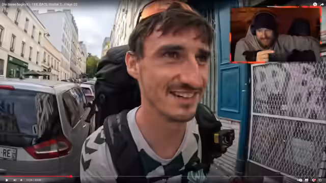 00:05:06Das Hauptziel wird nun das Verlassen der Pariser Innenstadt. Nach dem Scheitern des Rätsels beschließt der Streamer, sich Richtung Süden zu begeben, um eine Route aus der Stadt zu finden. Die Flucht gestaltet sich als äußerst schwierig, da er nach stundenlangen erfolglosen Versuchen, fremde Personen um Hilfe zu bitten, fast aufgibt. Letztlich gelingt es ihm, mit zwei netten Franzosen aus der Stadt zu kommen, die ihn mitnehmen, ihm Essen und Wasser schenken und ihn an den Stadtrand bringen.