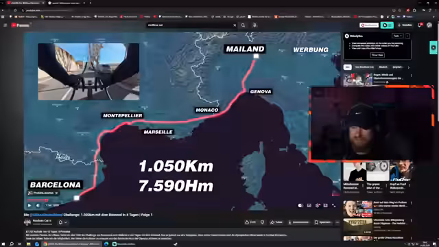 02:48:54Der Stream schwenkt auf ein neues Projekt von Alex Roofless Cat über. Es geht um die 'Allianz Deutschland Challenge', bei der Alex die Herausforderung antritt, 1000 Kilometer mit dem Rennrad in vier Tagen zu bewältigen. Die Route führt von Barcelona über Frankreich nach Mailand und beinhaltet 7590 Höhenmeter. Es wird gezeigt, dass Alex extrem gut vorbereitet ist, er hat professionelles Equipment, ein Carbon-Rennrad und sogar einen speziellen Radkoffer per Spedition schicken lassen. Die Vorbereitung wird als bislang durchgeplant und kontrolliert beschrieben, was auf eine Erfahrung aus früheren Projekten wie 'Chase' schließen lässt.