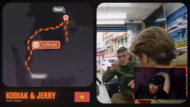 01:07:15Das Team beginnt in Hanoi und hat anfangs ein einfaches, aber passendes Rätsel gelöst. Die ersten Schritte verlaufen reibungslos, doch schon bald stoßen sie auf ihr erstes großes Problem: bei den Koordinaten für das Ziel gibt es unterschiedliche Übersetzungen und Uneinigkeit über die Bedeutung von 'Minuten'. Franz durchsucht den Rucksack nach den vorgegebenen Gegenständen, während der Streamer die 3700 Kilometer lange Reise und die großen Entfernungen nach Indonesien bewundert. Die Teams müssen sich fortan zu zweit fortbewegen, was das Trampen potenziell erschwert, aber auch deutlich sicherer macht. Ein Gefühl der Spannung und des Staunens über das gigantische Unterfangen prägt die Anfangsphase.