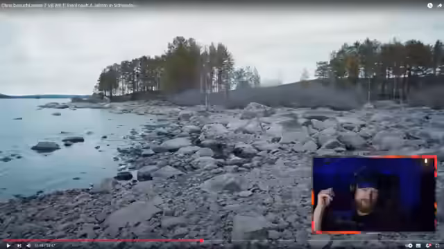 00:15:08Der Streamer beginnt seinen 'Reaktion'-Stream mit einem Video von Chris, alias Reloadiak. Chris besucht seine Seven-Waldinsel in Schweden nach vier Jahren. Auf der Insel wurde der Streamer in der ersten Staffel von 'Steppenwolf' eine Woche lang ausgesetzt. Der Streamer hat positive Erinnerungen an den Ort und freut sich, diese wiederzusehen. Gemeinsam mit seinem Bruder und einem Kameramann paddelt Chris mit einem Schlauchboot über den See zur Insel, wobei der niedrige Wasserstand eine deutlich veränderte Landschaft zeigt.