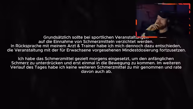00:45:23Der Streamer teilt seine Erfahrungen mit den Langzeitfolgen, die das Rennen an seinem Körper hinterlassen hat. Er brauchte anderthalb Wochen, um sich nach dem Rennen zu erholen, und berichtet von einem anhaltenden Taubheitsgefühl im kleinen Finger, der sich langsam aber stetig bessert. Die Frage nach möglichen dauerhaften Schäden wird angesprochen, wobei der Streamer eher optimistisch ist und den Taubheitsbereich als schmerzloses 'Andenken' betrachtet.