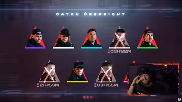03:04:14Die Challenge beginnt offiziell um 13 Uhr. Uwe erhält direkt ein Hotelzimmer, und es wird angenommen, dass eines der anderen Mädchen ebenfalls eines bekommt. Es gibt jedoch nur ein Zimmer, was zu Enttäuschung bei den anderen Teilnehmern führen wird. Taku, der alle Positionen kennt, muss nur noch zur Kante sprinten, während K1 zu Uwe sprinten muss, um die Challenge in fünf Minuten zu beenden. Ein Spieler hat Glück und steht die ganze Zeit neben dem Streamer, wodurch er die erste Karte erhält. Julius positioniert sich 150 Meter entfernt in einem McDonald's, um den Huntern Anweisungen zu geben und die Übersicht zu behalten. Er rät den Huntern, sich zu entspannen, Kaffee zu trinken und erst bei wirklich Verdächtigen einzugreifen. Adrian und der Streamer vereinbaren, nach zehn Minuten zu patrouillieren, falls kein Spieler vorbeikommt. Der Streamer versucht, unauffällig zu bleiben, indem er die Bodycam verdeckt hält und so tut, als würde er telefonieren. Es wird vermutet, dass Fabio als Agent eingesetzt wird, dieser schläft jedoch noch.