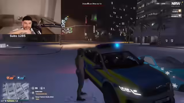 03:12:48Das Minecraft-RP-Szenario gestaltet sich chaotisch. Der Streamer spielt eine Polizeistreife und konfrontiert andere Spieler. Es kommt zu einem szenischen Streit und einer Verfolgungsjagd, bei der der Streamer fiktiv einen Spieler 'anfährt'. Die Szene ist komödiantisch überzeichnet und dient der reinen Unterhaltung.